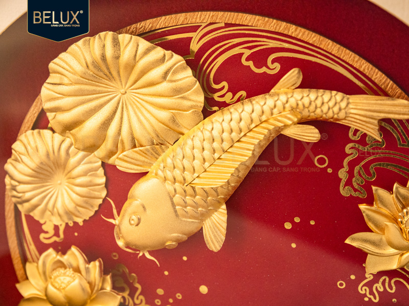 Tranh Cá Chép Hoa Sen Nền Đỏ Dát Vàng 24K kích thước 26x26cm là một sản phẩm thủ công cao cấp thuộc dòng quà tặng phong thủy của Belux. Tác phẩm được chế tác bằng kỹ thuật dát vàng 24K tinh xảo, thể hiện hình ảnh cá chép bơi lội giữa hoa sen trên nền đỏ nổi bật. Từng chi tiết – từ dáng cá, gợn nước đến cánh sen – đều được thiết kế độc quyền, chau chuốt tỉ mỉ bởi đội ngũ nghệ nhân Belux.