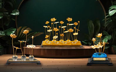 Cây sen dát vàng 24K – Biểu tượng của sự thanh khiết và trí tuệ, thích hợp trưng bày tại phòng khách hoặc bàn làm việc.
