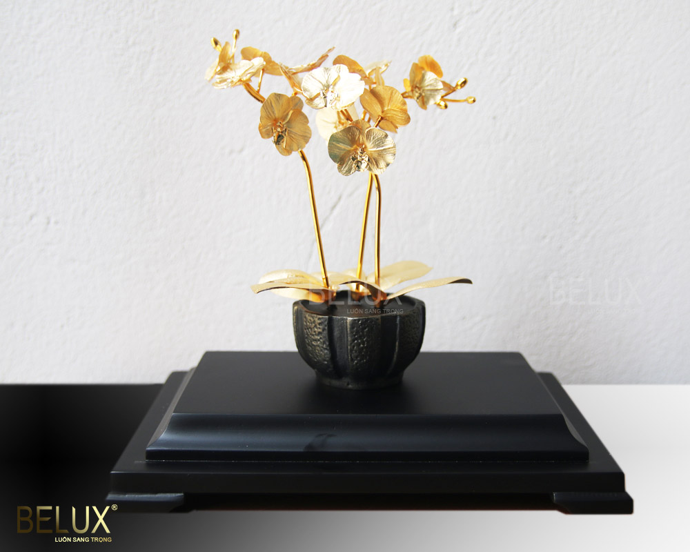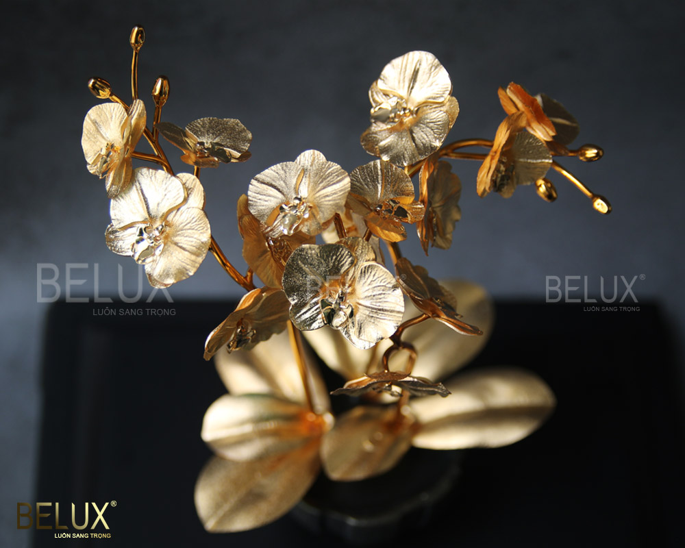 Chậu Lan Hồ Điệp 3 Cành dát vàng 24k là tác phẩm kết tinh giữa nghệ thuật chế tác tinh xảo và ý nghĩa phong thủy sâu sắc. Ba cành lan được thiết kế mềm mại, thanh thoát, phủ lớp vàng 24k óng ánh, toát lên vẻ đẹp sang trọng, thuần khiết và đầy sức sống.