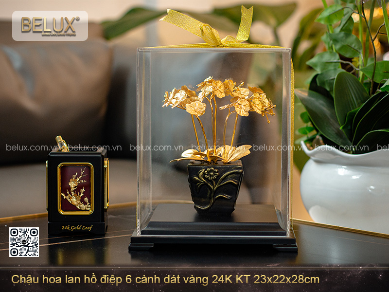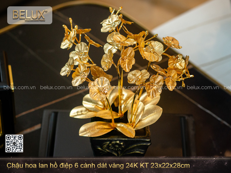 Chậu hoa lan hồ điệp 6 cành cánh dát vàng 24k mang vẻ đẹp thanh cao, sang trọng, đẳng cấp. Hơn nữa, ẩn chứa sâu bên trong sản phẩm là những thông điệp sâu sắc cùng ý nghĩa phong thủy tốt lành. Chính vì vậy sản phẩm đang được rất nhiều người yêu thích trang trí trong phòng hay là quà biếu tặng.