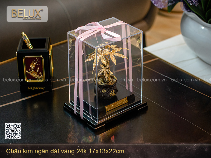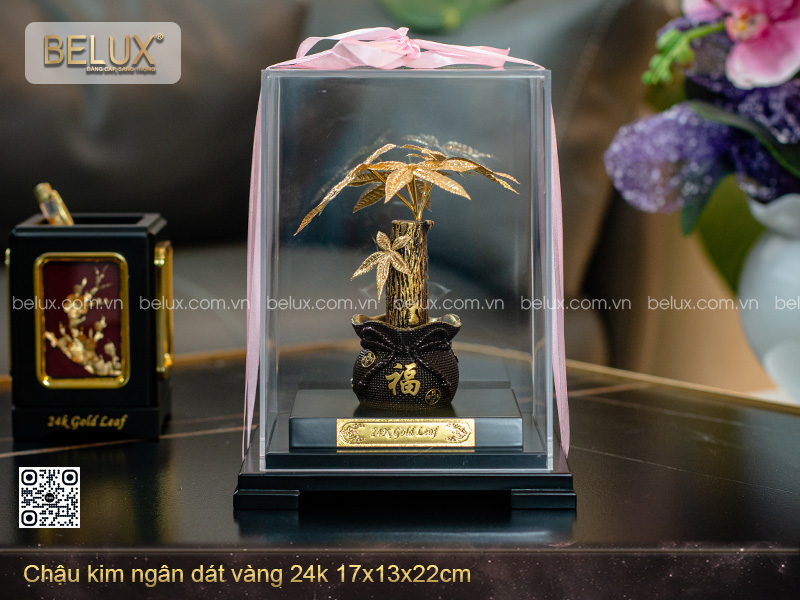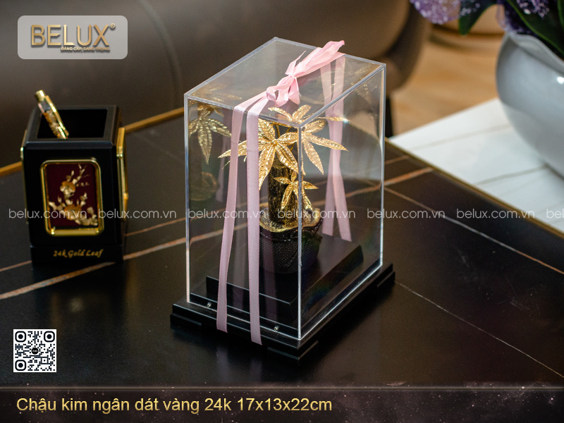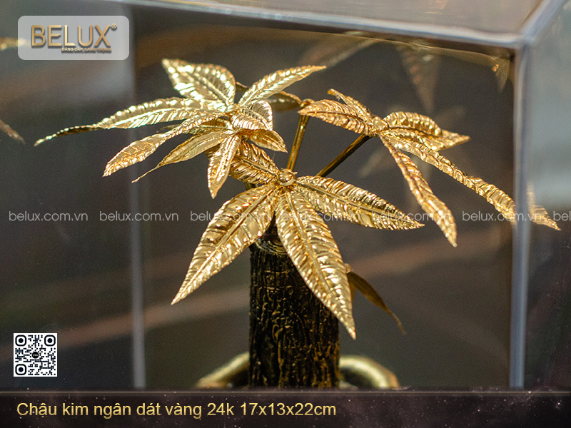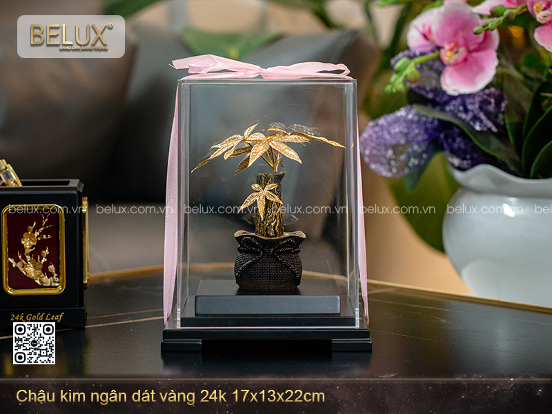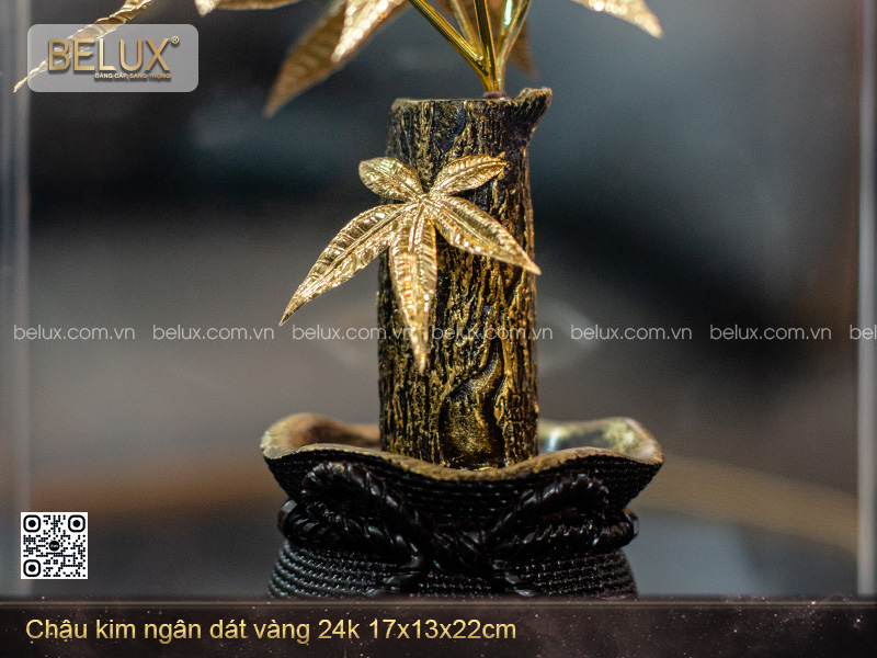 Chậu kim ngân dát vàng 24k được chế tác công phu mang vẻ đẹp tinh tế và sang trọng. Sản phẩm có kích thước nhỏ nhắn để trưng bày tại bàn làm việc hoặc tủ kính. Và phù hợp để dành tặng cho những người quan trọng như đối tác, lãnh đạo, khách hàng…