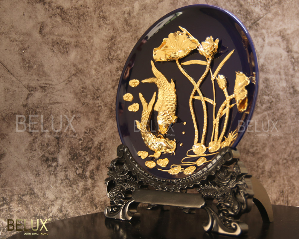 Đĩa cá chép hoa sen dát vàng 24k vô cùng độc đáo. ấn tượng, khiến ai ai cũng yêu thích và muốn sở hữu ngay. Đĩa các chép hoa sen ở đây tái hiện hình ảnh đôi cá chép đang bơi lội trông đầm sen. Những bông sen, nụ sen, lá sen vươn ra nhiều hướng. Dưới bàn tay tài hoa của những người nghệ nhân, bức tranh cá chép hoa sen trên mặt đĩa được tái hiện một cách sinh động, chân thật qua từng đường nét mềm mại, uyển chuyển. Trên nền đĩa ngọc màu xanh tím than, những họa tiết hoa văn được dát vàng 24K sáng bóng tạo hiệu ứng tương phản đối lập. Màu vàng là màu của quý tộc, thể hiện sự cao sang, quyền quý. Chân đỡ mặt đĩa được làm bằng gỗ cao cấp với hình rồng chạm khắc hai bên tạo độ chắc chắn, giúp trưng abyf ở nhiều không gian khác nhau. Đồng thời càng làm tăng thêm tính sang trọng, đẳng cấp cho sản phẩm.