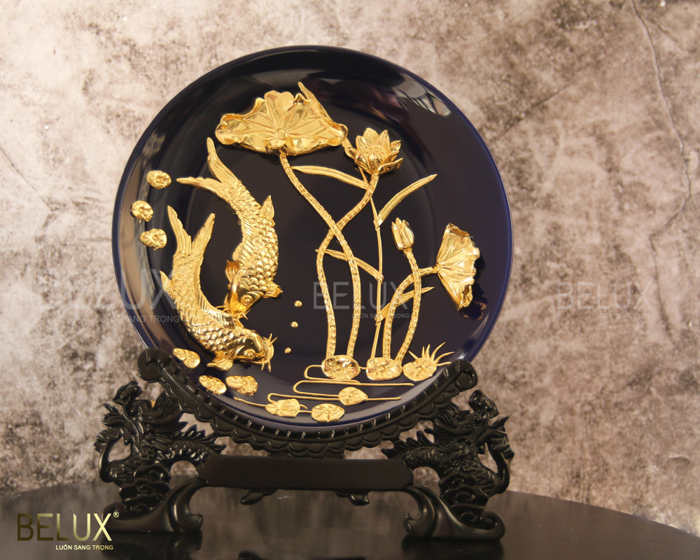 Cách trưng bày Đĩa cá chép hoa sen dát vàng 24k