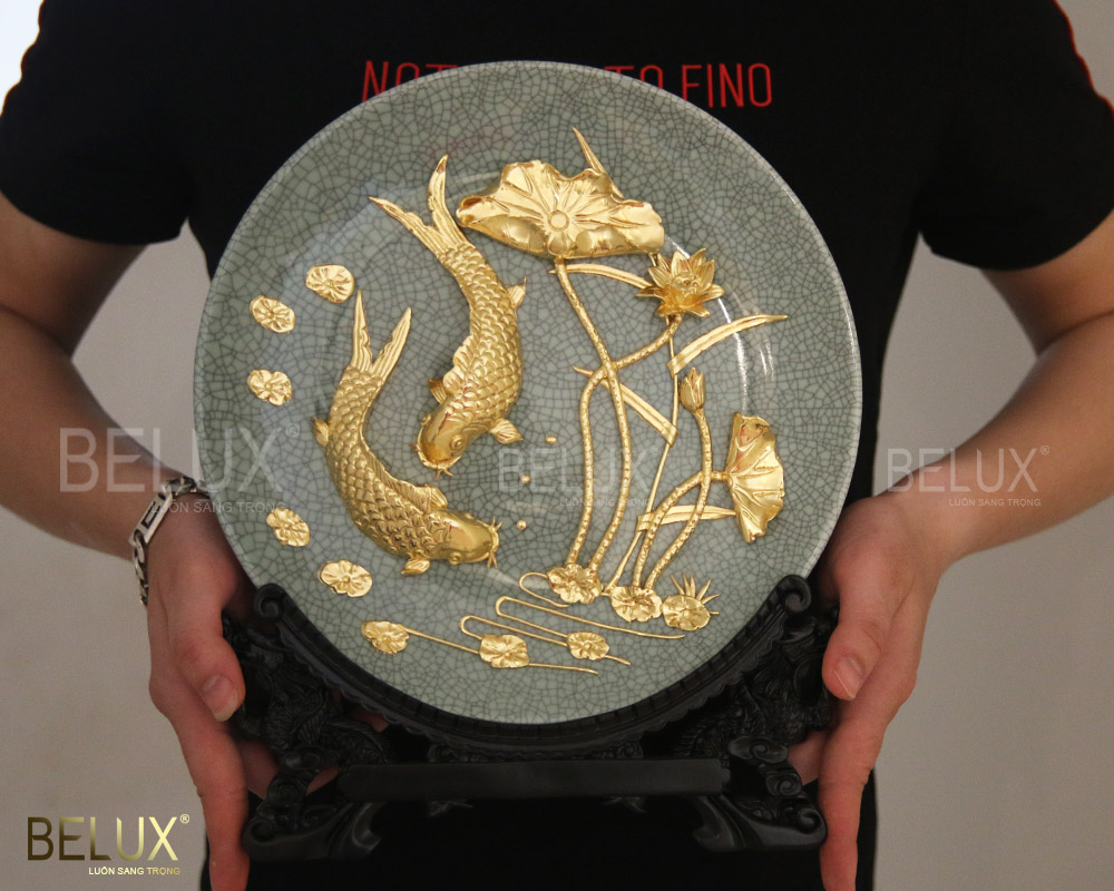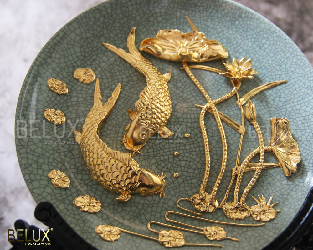 đĩa cá chép hoa sen dát vàng còn được coi như vật phẩm phong thủy cực kỳ tốt lành. Cá chép biểu trưng cho sức mạnh, tài trí, lòng dũng cảm. Cá chép vượt vũ môn hóa rồng chỉ con đường quan lộ gặp nhiều may mắn. Đồng thời thể hiện sự kiên cường, dũng cảm, biết vượt qua mọi khó khăn gian khổ để vươn tới tương lai tươi sáng. Hai con cá quấn quýt bên nhau cũng thể hiện sự gắn kết trong tình yêu. Hoa sen là quốc hoa của Việt Nam. Loài hoa này biểu tượng cho vẻ đẹp thanh cao, khí chất thoát tục. Và mang ý nghĩa về sự ấm no, hạnh phúc, sung túc giàu có. Hoa sen đi liền với cá chép biểu ý “dư dả liên tục”, tài lộc luôn dồi dào vô biên.