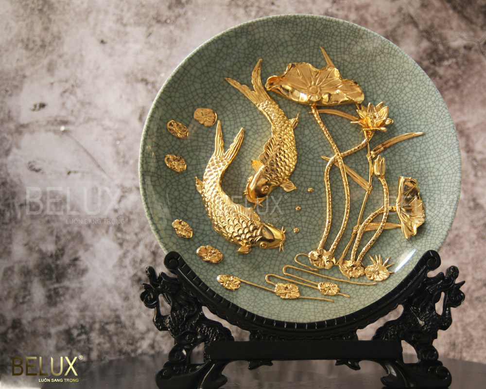 Cách trưng bày Đĩa cá chép hoa sen dát vàng D25 nền xanh ngọc