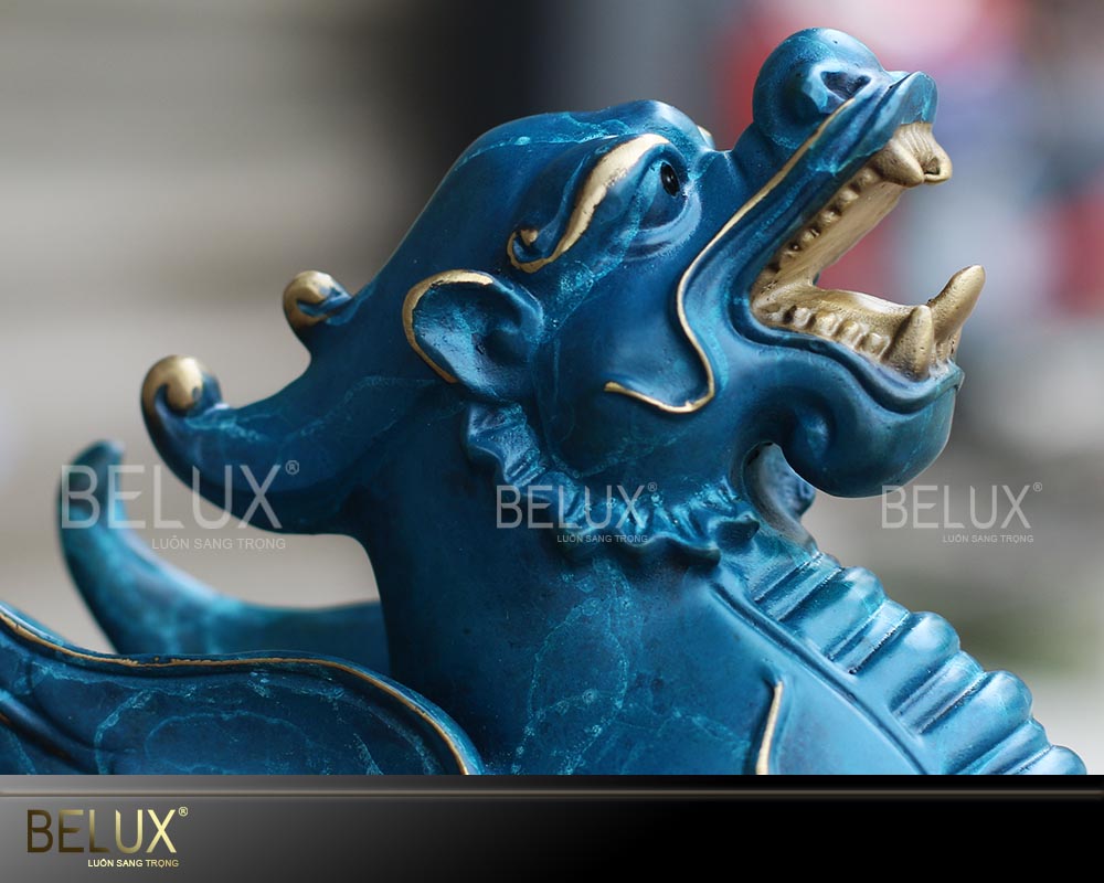 Tỳ Hưu, theo sách cổ là một loại quái thú hung dữ. Tỳ Hưu nuôi dưỡng sự giàu có và thu thập sinh khí của bốn phương. Truyền thống Trung Quốc có phong tục thỉnh “Tỳ Hưu”. Giống như rồng và sư tử, nó có tác dụng xua đuổi tà ác ở nơi phò trợ, mang lại sức khỏe, may mắn và tài lộc. Mẫu tượng được Belux chế tác thủ công trên nguyên liệu đồng thau. Sau quá trình đúc và sửa nguội, Belux sử dụng chất liệu men sứ để phủ lên bộ áo của đôi tỳ hưu. Từng đường nét hoa văn nhờ vậy cũng được nổi bật hơn. Đôi tượng có màu xanh thẫm cùng với chất liệu đồng bền bỉ rất phù hợp với gia chủ mệnh Thủy.