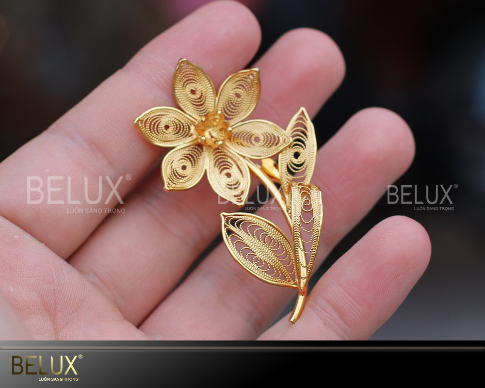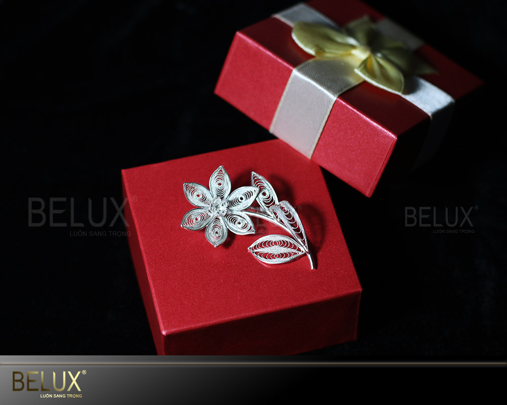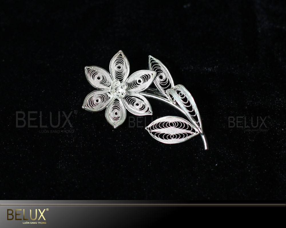Mẫu sản phẩm Hoa cài áo là dòng sản phẩm thủ công được nghệ nhân kim hoàn của Belux chết tác trên chất liệu bạc nguyên chất. Bằng đôi bàn tay tài hoa, khéo léo của mình, các nghệ nhân của Belux đã dùng phương pháp đậu bạc cổ truyền, chế tác những thỏi vàng bạc thành những sợi dài mảnh li ti rồi tết chúng lại thành từng chi tiết nhỏ tạo nên mẫu hoa cài áo. Sản phẩm có thể được mạ vàng theo yêu cầu của quý khách.