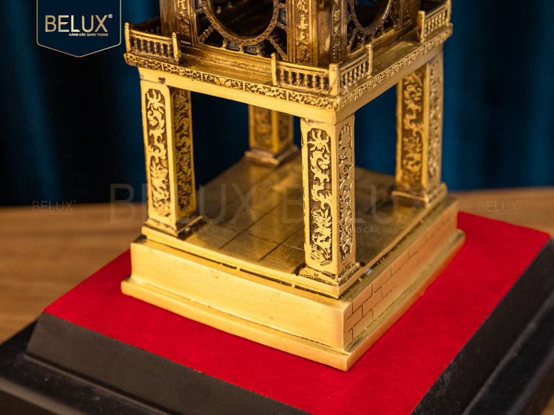 Sản phẩm được chế tác thủ công từ chất liệu đồng vàng cao cấp, bề mặt đánh sáng bóng mang đến vẻ sang trọng và bền đẹp theo thời gian. Bố cục của mô hình giữ nguyên tinh thần kiến trúc gốc: bốn trụ vuông vững chắc, mái ngói cong mềm mại, cùng hệ thống hoa văn chạm khắc tinh tế. Điểm nhấn là phần đế gỗ đỏ chắc chắn, góp phần tôn lên sự uy nghi và giá trị thẩm mỹ của tổng thể tác phẩm.