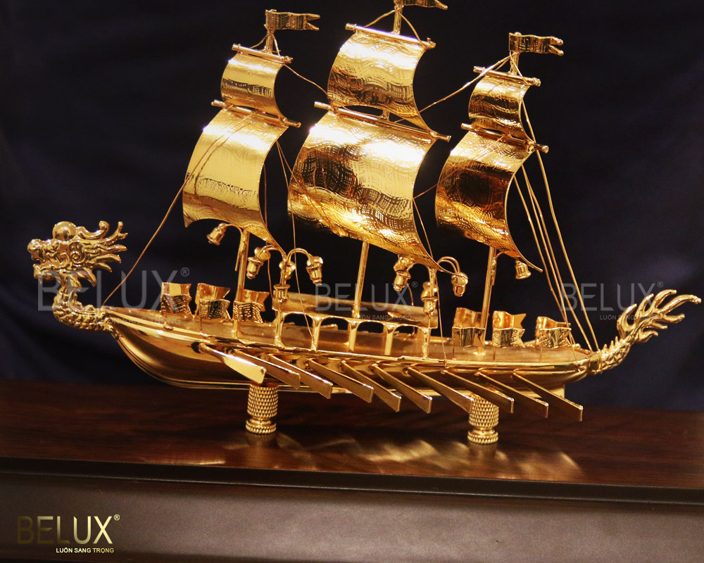 Mô hình cao cấp mạ vàng chế tác hoàn toàn thủ công cực kỳ công phu, tỉ mỉ, từ thân thuyền, những cánh buồm hay đến cả những chi tiết nhỏ nhất như chiếc vảy rồng, sợi dây căng buồm…. Do đó sản phẩm mang vẻ đẹp tinh xảo, chân thực, sinh động. Ở đây ta có thể thấy rõ sự sáng tạo không ngừng của những nghệ nhân để cho ra sản phẩm độc đáo, hoàn toàn mới. Phần thân thuyền được gắn thêm đầu và đuôi rồng tạo hình ảnh của một chú rồng thiêng dũng mãnh, quyền lực. Dáng thuyền có phần hướng lên cao về phía đầu rồng cho thấy sự mạnh, khí thế xông pha. Đặc biệt, toàn bộ con thuyền được mạ vàng 24k lấp lánh, tạo vẻ cao sang, quyền quý. Ngoài ra, để tăng thêm độ trang trọng, lịch sự của sản phẩm, chúng tôi còn thiết kế thêm đế gỗ cao cấp, hộp mica bảo vệ và đóng gói trong hộp quà đỏ sang trọng. Chắc chắn đây sẽ là món quà hoàn hảo cho những người doanh nhân, quan chức.