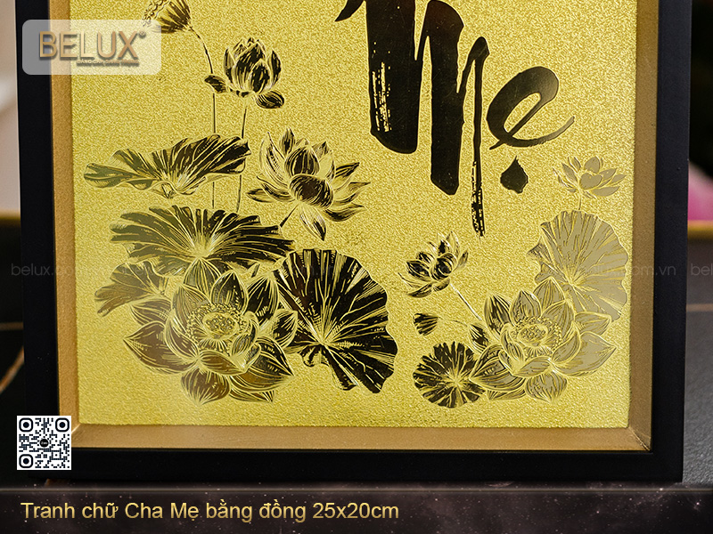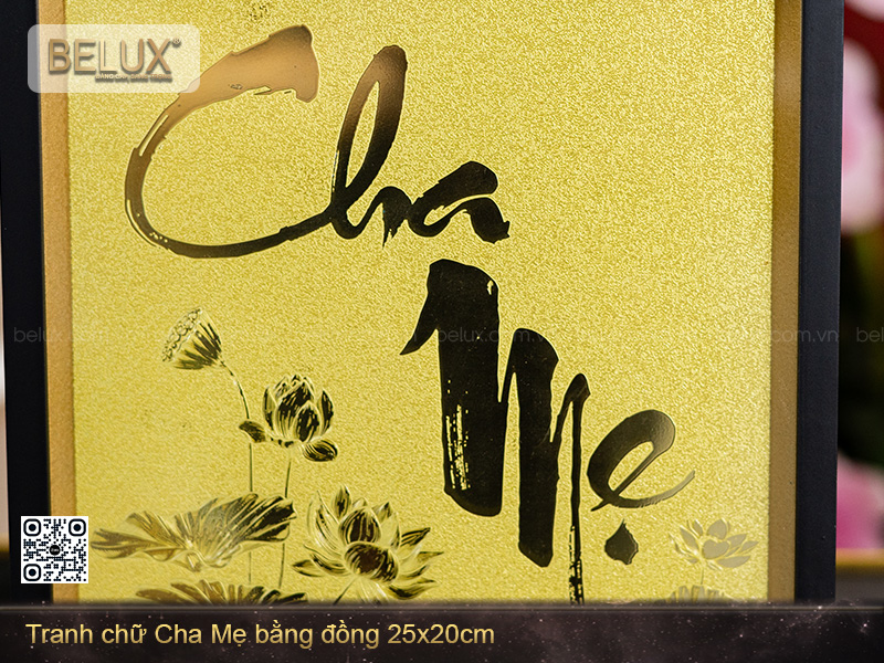 Tranh Chữ Cha Mẹ bằng đồng là một sản phẩm quà tặng thủ công cao cấp do Quà tặng Belux thiết kế và chế tác độc quyền. Bức tranh có kích thước 25x20cm – nhỏ gọn, tinh tế, phù hợp để đặt bàn, trưng bày trên kệ sách, bàn thờ, hoặc treo tường trong phòng khách, phòng thờ, không gian làm việc hay nơi trang trọng trong gia đình.