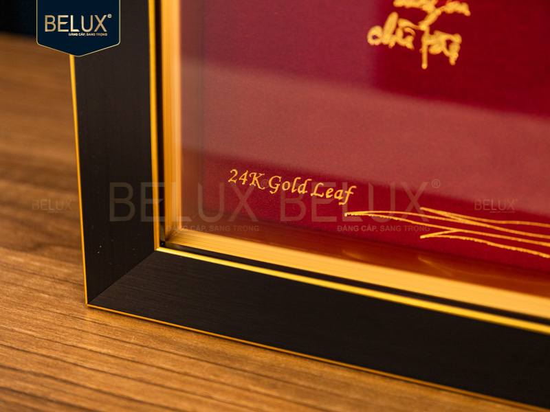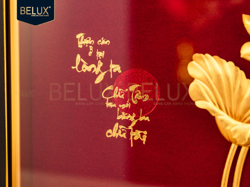 Điểm nhấn của sản phẩm là chữ “Tâm” được thể hiện theo phong cách thư pháp cách điệu, mềm mại mà vẫn vững chãi. Phần chữ được dát vàng 24k bằng kỹ thuật thủ công, tạo nên lớp vàng óng ánh nổi bật trên nền tranh tinh xảo. Bức tranh mang vẻ đẹp hài hòa giữa truyền thống và hiện đại, giữa hình thức sang trọng và chiều sâu tinh thần.