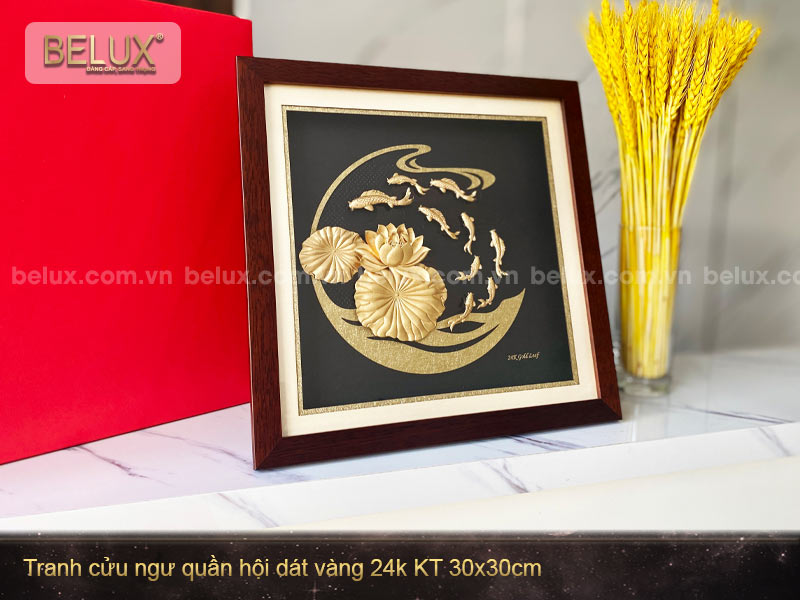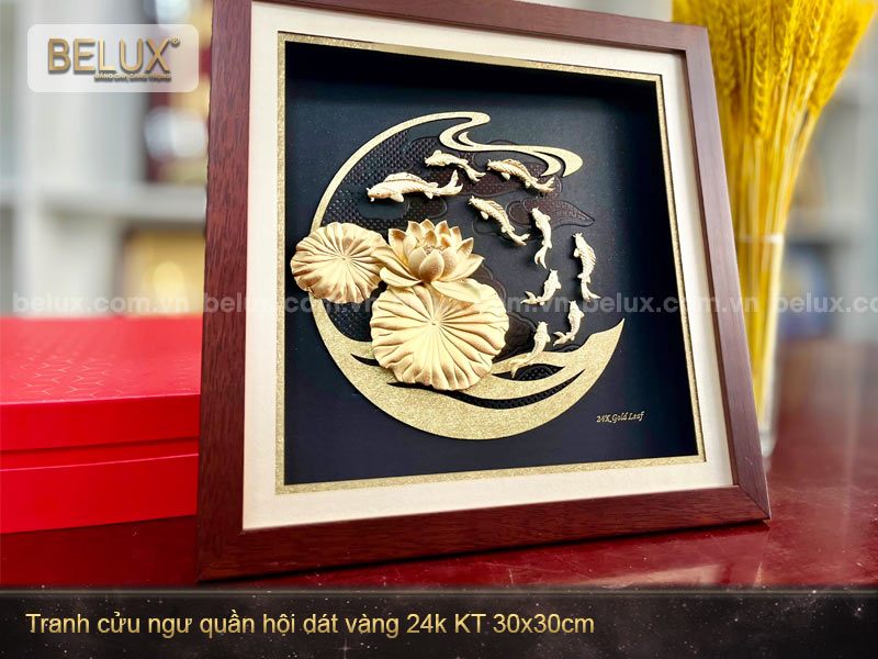 - Tranh Cửu Ngư quần hội dát vàng 24k là bức tranh với chín con cá chép quần hội bên những đóa hoa sen. Đây là bức tranh tài lộc rất phù hợp để treo trong phòng khách, phòng thờ hay phòng làm việc.
