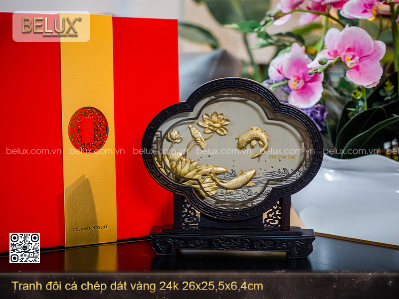 Việc dát vàng 24K không chỉ tôn vinh giá trị thẩm mỹ mà còn tăng cường yếu tố vượng khí. Vàng trong phong thủy là đại diện của sự thịnh vượng, giàu có và phát triển ổn định. Vì vậy, treo hoặc đặt tranh đôi cá chép dát vàng trong nhà, văn phòng không chỉ mang tính trang trí mà còn hỗ trợ tăng vận tài, mang lại sự hanh thông và hài hòa trong cuộc sống.