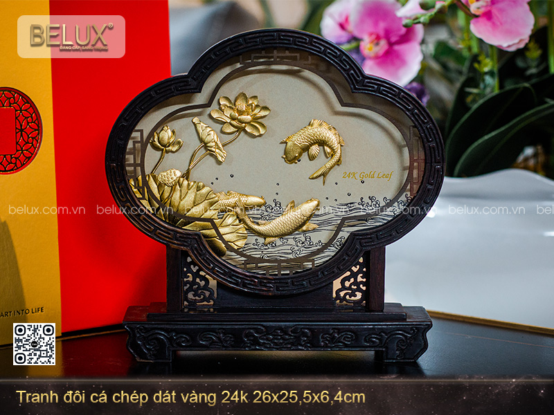 Hình ảnh đôi cá chép được bố trí cân đối, sống động và hài hòa trong một bố cục trang nhã. Lớp vàng dát lên từng đường nét giúp tranh giữ được vẻ sang trọng, bền đẹp theo thời gian. Kích thước vừa phải, đi kèm hộp và túi quà tặng chỉnh chu, tranh dễ dàng trưng bày tại bàn làm việc, kệ sách, tủ trưng bày hoặc làm quà tặng trong các dịp đặc biệt.