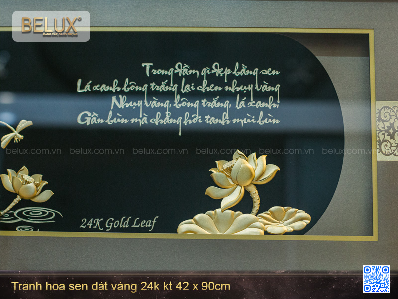 - Tranh hoa sen dát vàng 24K gây ấn tượng mạnh bởi khung tranh màu tối đẹp tinh tế. Tranh có nền tối làm nổi bật bố cục hoa sen và dòng chữ nổi bật: