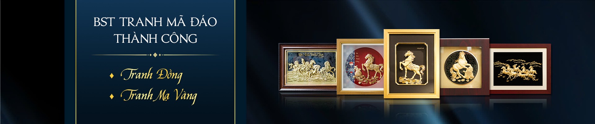 Tranh mã đáo thành công mạ vàng 24K: Sản phẩm cao cấp, chế tác công phu, mang vẻ đẹp sang trọng, quý phái. Lớp vàng 24K không chỉ làm tăng giá trị thẩm mỹ mà còn nâng tầm ý nghĩa phong thủy, thích hợp làm quà tặng cho doanh nhân, sếp hoặc đối tác quan trọng.