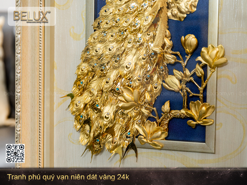 Tranh phú quý vạn niên dát vàng 24k khổ dọc mang vẻ đẹp thanh cao, nhã nhặn và được xếp vào dòng tranh vip của BELUX. Sản phẩm rất thích hợp để làm quà tặng tân gia, khai trương, sinh nhật hoặc ký niệm lễ tình yêu, kỉ niệm ngày cưới.