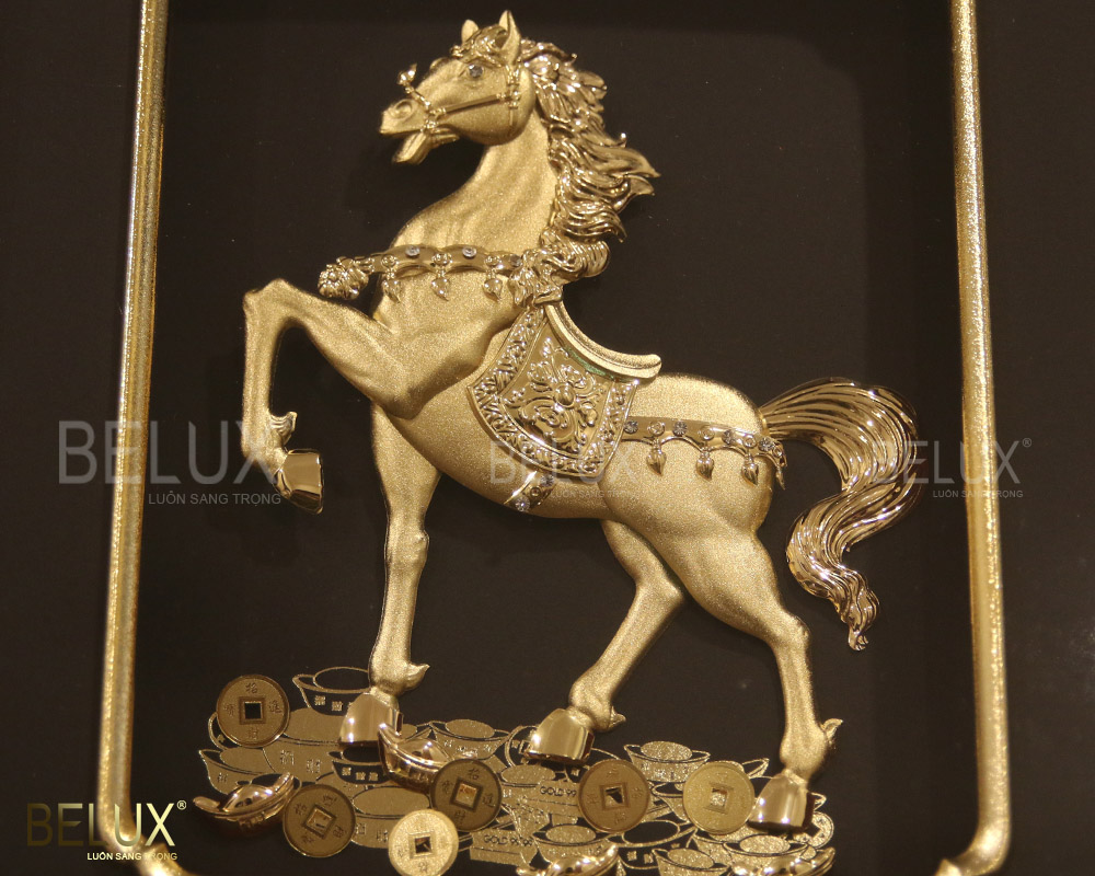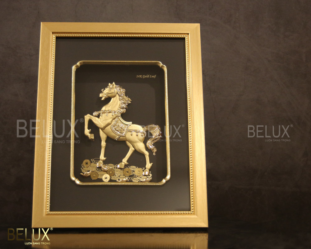 Tranh quà tặng mã đáo thành công dát vàng 24k tái hiện hình ảnh chú ngựa dũng mãnh đang tiến về phía trước. Dưới chân ngựa là những thỏi vàng và đồng tiền cổ. Đây là tác phẩm nghệ thuật đặc biệt, có giá trị cao. Bởi bức tranh được chế tác hoàn toàn thủ công, toàn bộ hình ảnh trên bức tranh đều được dát vàng 24k. Từng đường nét trên bức tranh được thể hiện rõ ràng, sắc nét. Bức tranh có hai màu chủ đạo là vàng và đen là hai màu tương phản đối lập. Tất cả tạo lên một bức tranh cao cấp đẹp, lung linh, tinh xảo, sang trọng. Bức tranh sẽ là điểm nhấn đặc biệt cho không gian, tạo không khí mới mẻ, thu hút mọi ánh nhìn.