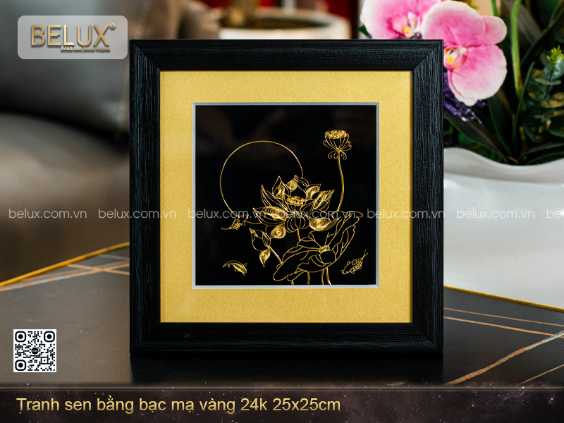 Tranh Hoa Sen Bằng Bạc Mạ Vàng 24K kích thước 25x25cm là một trong những sản phẩm thủ công tinh xảo, được thiết kế độc quyền bởi Quà tặng Belux. Tranh được chế tác bằng kỹ thuật đậu bạc truyền thống – một nghệ thuật kim hoàn lâu đời, sử dụng những sợi bạc mảnh để tạo hình hoa sen sống động, sau đó mạ vàng 24K để tăng độ sáng, độ bền và tính thẩm mỹ cho toàn bộ tác phẩm.