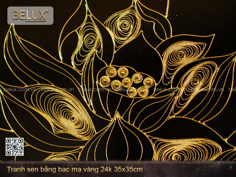 Điểm nổi bật của tranh là hoa sen được tạo hình bằng kỹ thuật đậu bạc thủ công, sử dụng sợi bạc nguyên chất để tạo hình hoa văn. Đây là kỹ thuật chế tác truyền thống, đòi hỏi độ tinh xảo cao và sự tỉ mỉ trong từng chi tiết. Sau khi hoàn thiện phần tạo hình, toàn bộ chi tiết bạc được mạ vàng 24k, tạo nên hiệu ứng ánh kim sang trọng, nổi bật nhưng vẫn giữ được nét thanh tao vốn có của hoa sen.