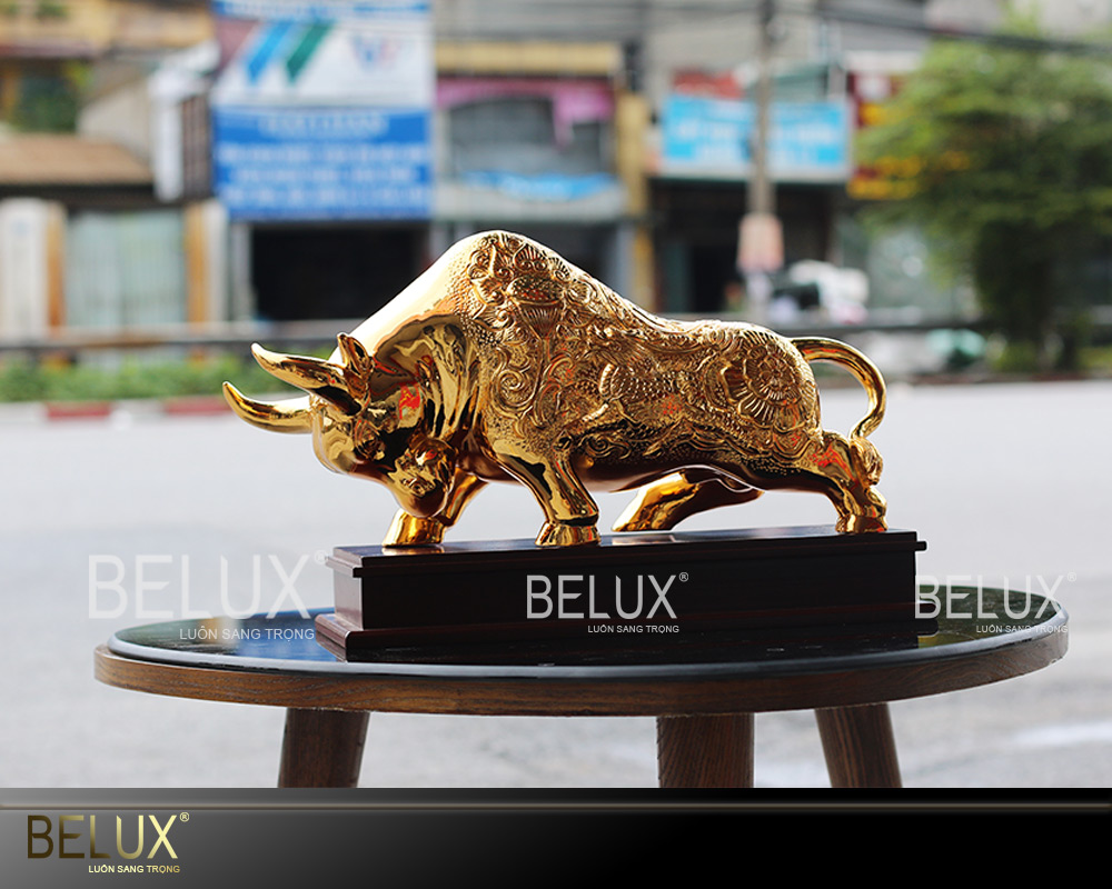 - Tượng với chất liệu đồng vàng mạ vàng 24k, kích thước 40x21cm (DxC) theo phương pháp điện phân hiện đại. Do các nghệ nhân lâu năm của Belux chế tác. Thiết kế tượng với dáng đứng uy hùng, đường nét chạm khảm tinh tế cho tượng bò mạnh mẽ hơn bao giờ hết.