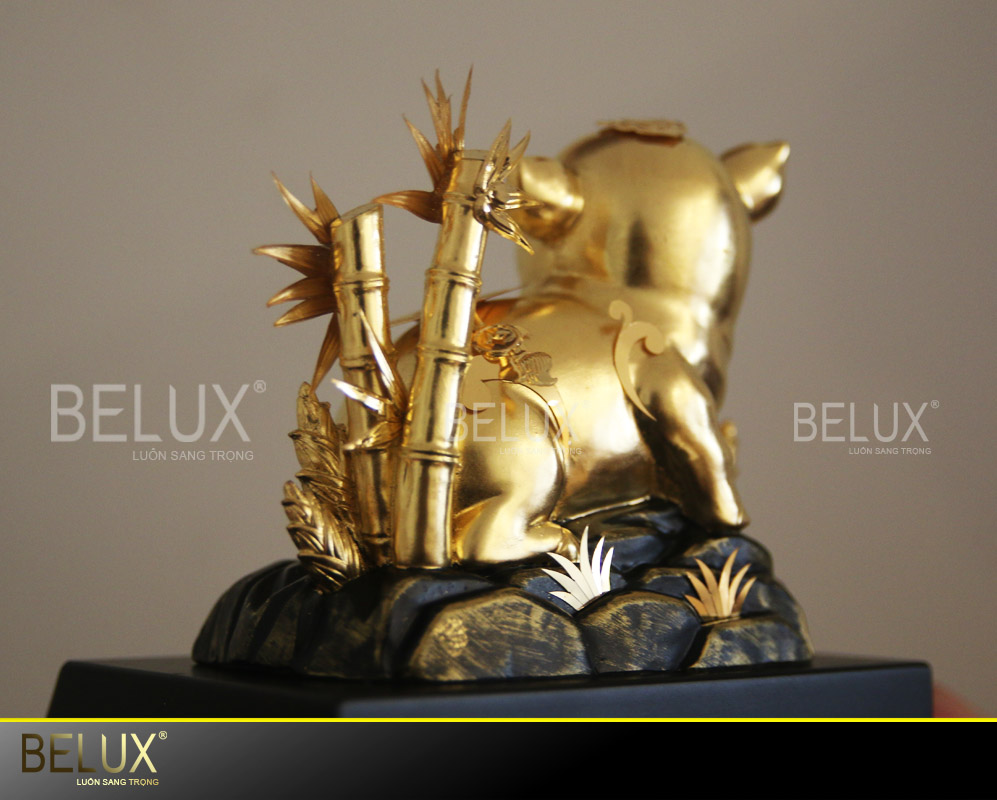Với những đường nét mềm mại, chạm khắc tinh tế, chú heo được khắc họa một cách chân thực, sinh động với vẻ mặt tươi cười phấn khởi. Toàn bộ bề mặt chú heo được dát vàng 24k tạo vẻ đẹp sang trọng, độc đáo, cuốn hút nhưng vẫn gần gũi, thân thuộc nhờ việc kết hợp với lũy tre và bãi cỏ mà chú heo nằm bên trên.
